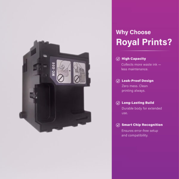 Maintenance box for Canon PIXMA TS and TR series printers (MC-G06). Smart chip ensures seamless auto-detection with plug & print convenience. Manages excess ink during cleaning cycles.