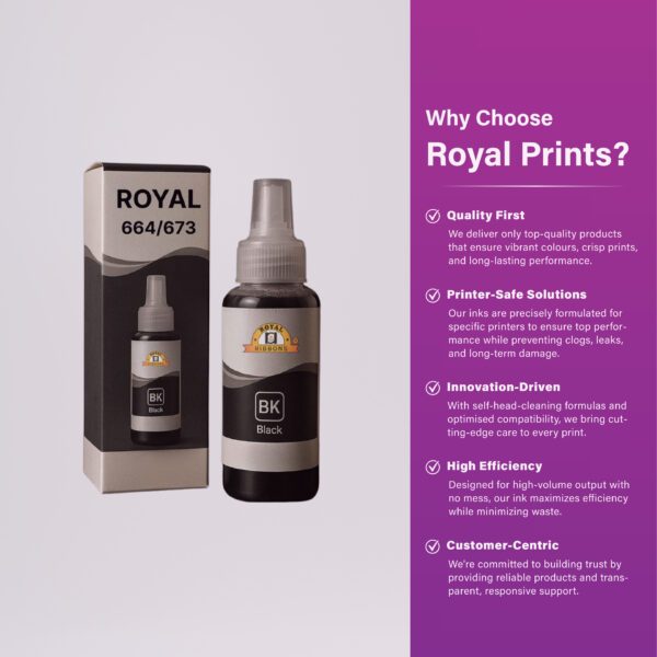 70ml refill ink set for Epson 664 and 673 ink tank printers. Built-in head cleaning formula and globally certified composition for sharp text and accurate colour reproduction at all volumes.