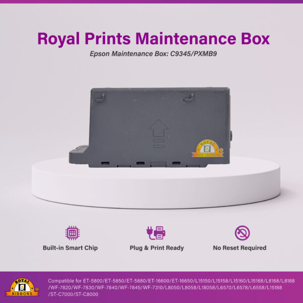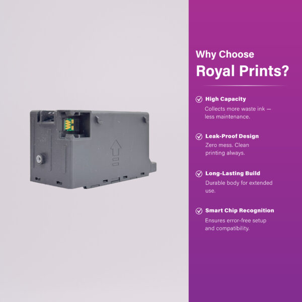 Replacement waste ink maintenance box with built-in smart chip for Epson EcoTank and WorkForce printers. No reset needed — simply plug in and continue printing. Ideal for home offices and high-volume users.