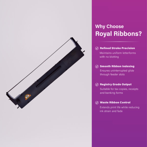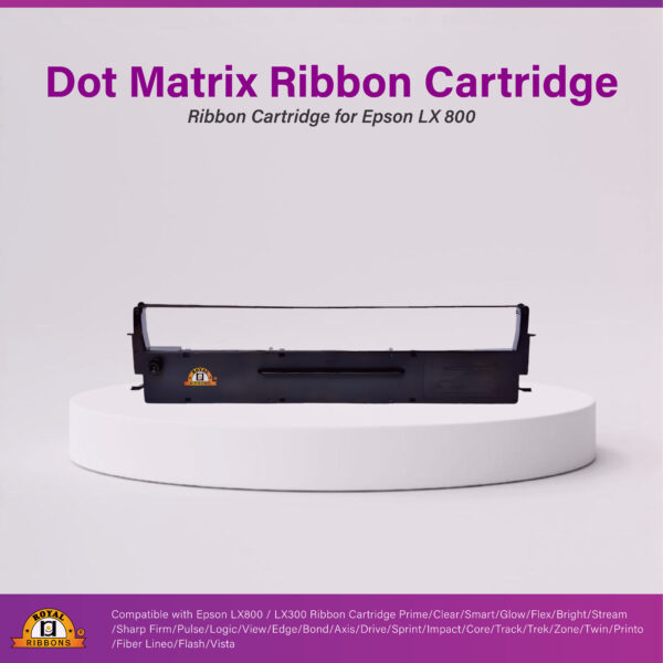 Durable dot matrix ribbon for Epson LX-800 and LX-300 series printers. Consistent dark print quality for billing counters, banks, and continuous stationery. Engineered for reduced printhead wear.