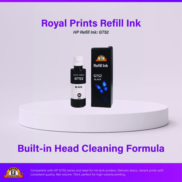 70ml dye-based refill ink for HP GT52 ink tank printers. Globally certified ink with built-in head cleaning formula for consistent nozzle health and vibrant, long-lasting print results.